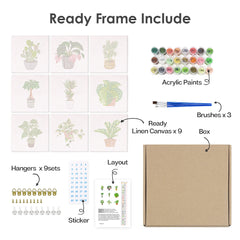 Enjoy a relaxing and creative activity with our 9 Mini Painting Set – Paint by Numbers Houseplants. Each kit includes everything you need: nine pre-numbered mini canvases, eco-friendly acrylic paints, and detail brushes.